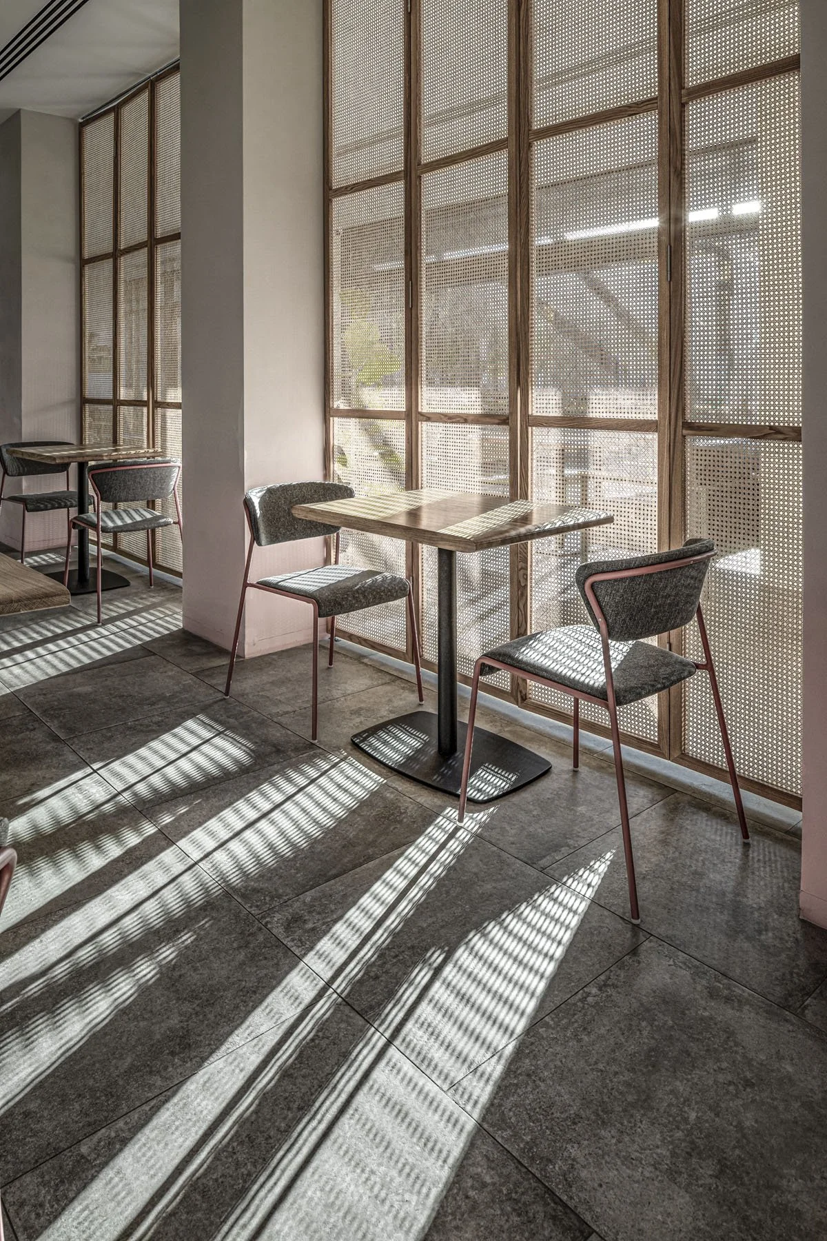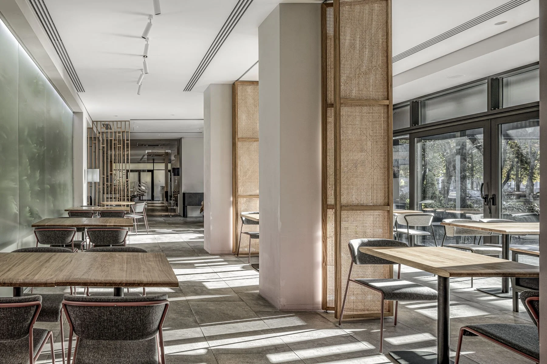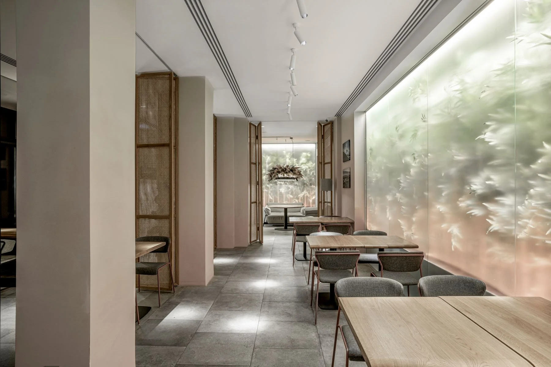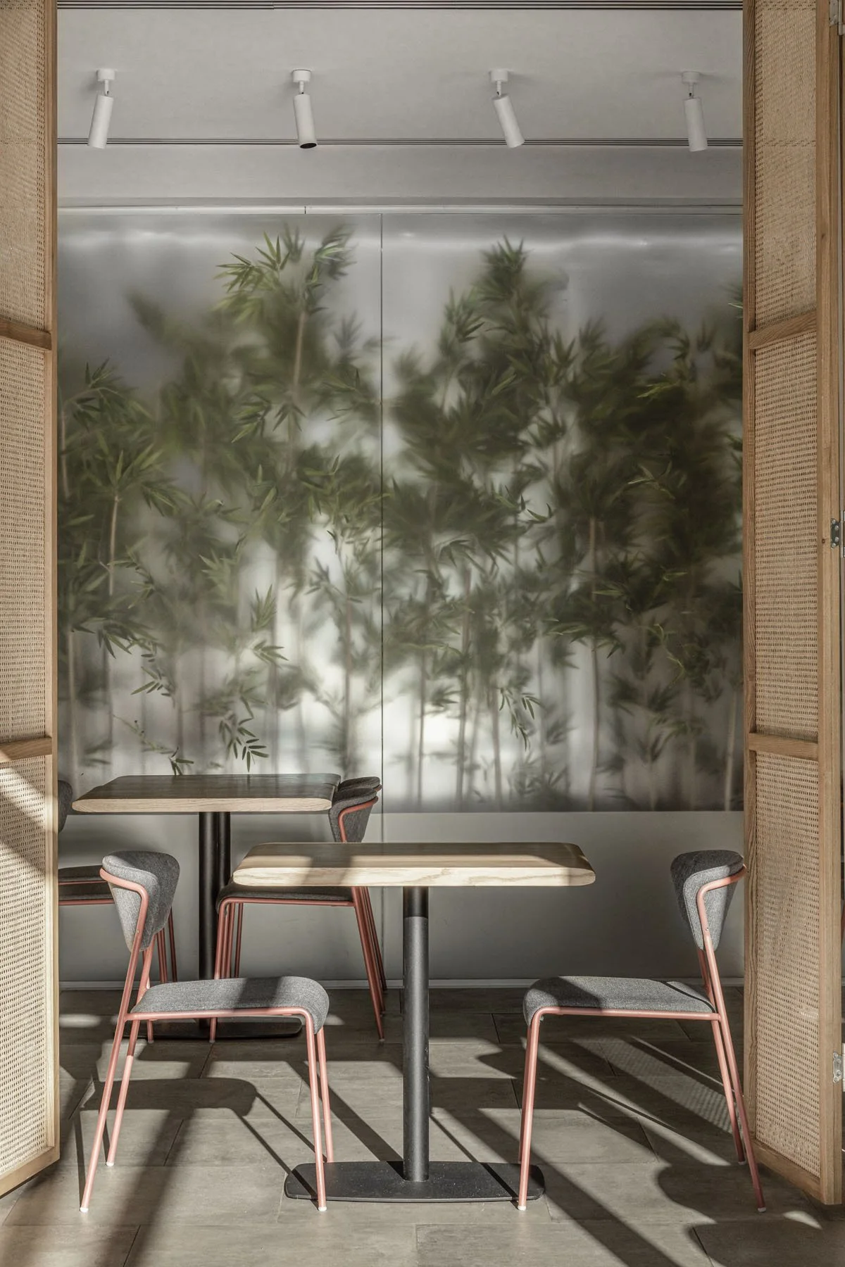 In the interior of "Sweetlo," white color and pure laconic shapes take over. There is plenty of natural light that pours in the hall via the big windows. Some color accents were put with the geometrical paintings in orange, yellow, and blue shades on the walls. The pink and grey chairs followed the lead and diluted the color palette a little. The primary materials are oak, rattan, and ground glass, behind which enlightened bamboo sprouts are placed. The restaurant space can be modified by moving sliding partitions made from rattan. That allows to separate some space for the local wine club meetings or unite the hall at other times.