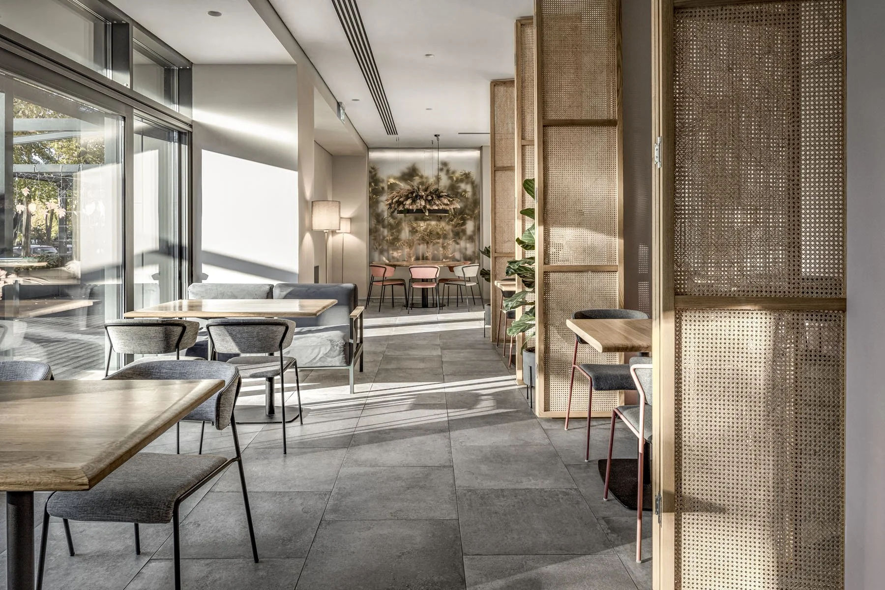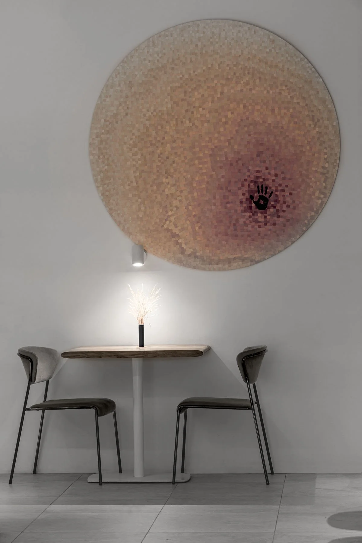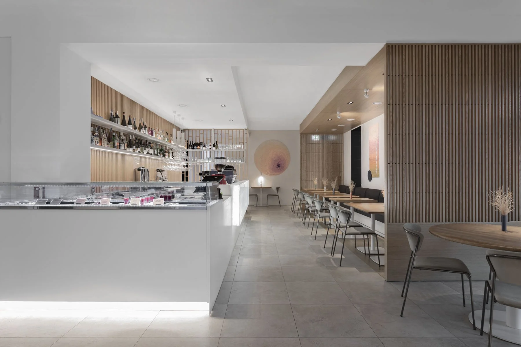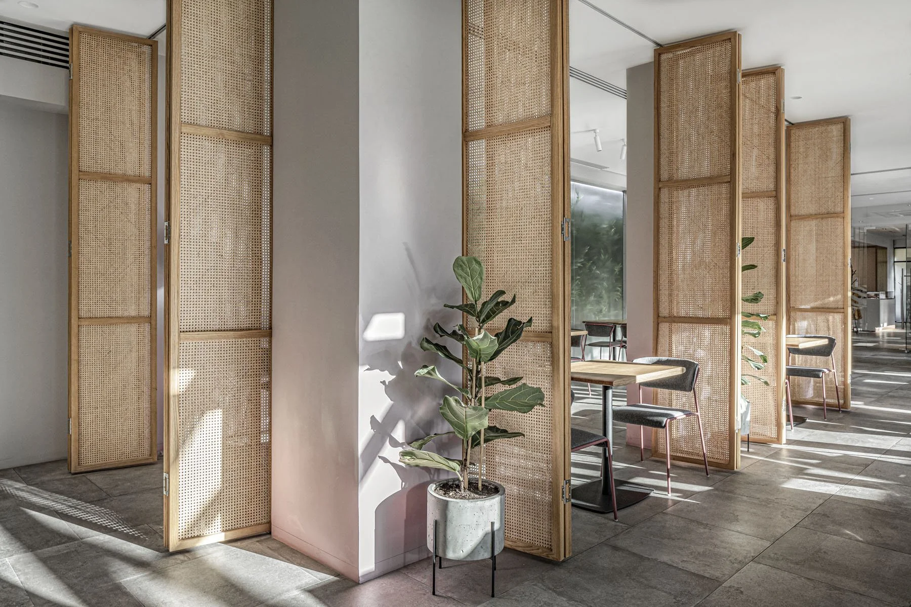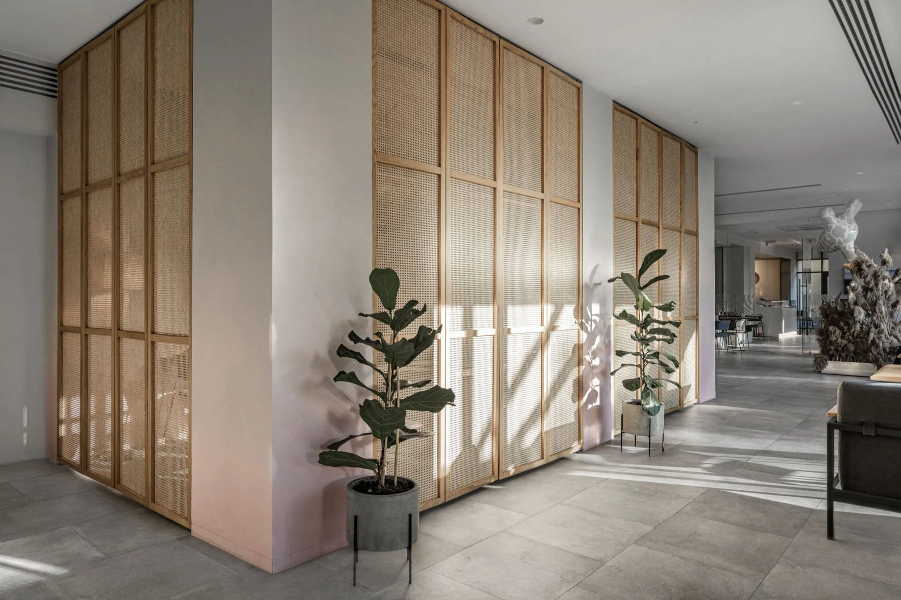 In the interior of "Sweetlo," white color and pure laconic shapes take over. There is plenty of natural light that pours in the hall via the big windows. Some color accents were put with the geometrical paintings in orange, yellow, and blue shades on the walls. The pink and grey chairs followed the lead and diluted the color palette a little. The primary materials are oak, rattan, and ground glass, behind which enlightened bamboo sprouts are placed. The restaurant space can be modified by moving sliding partitions made from rattan. That allows to separate some space for the local wine club meetings or unite the hall at other times.
