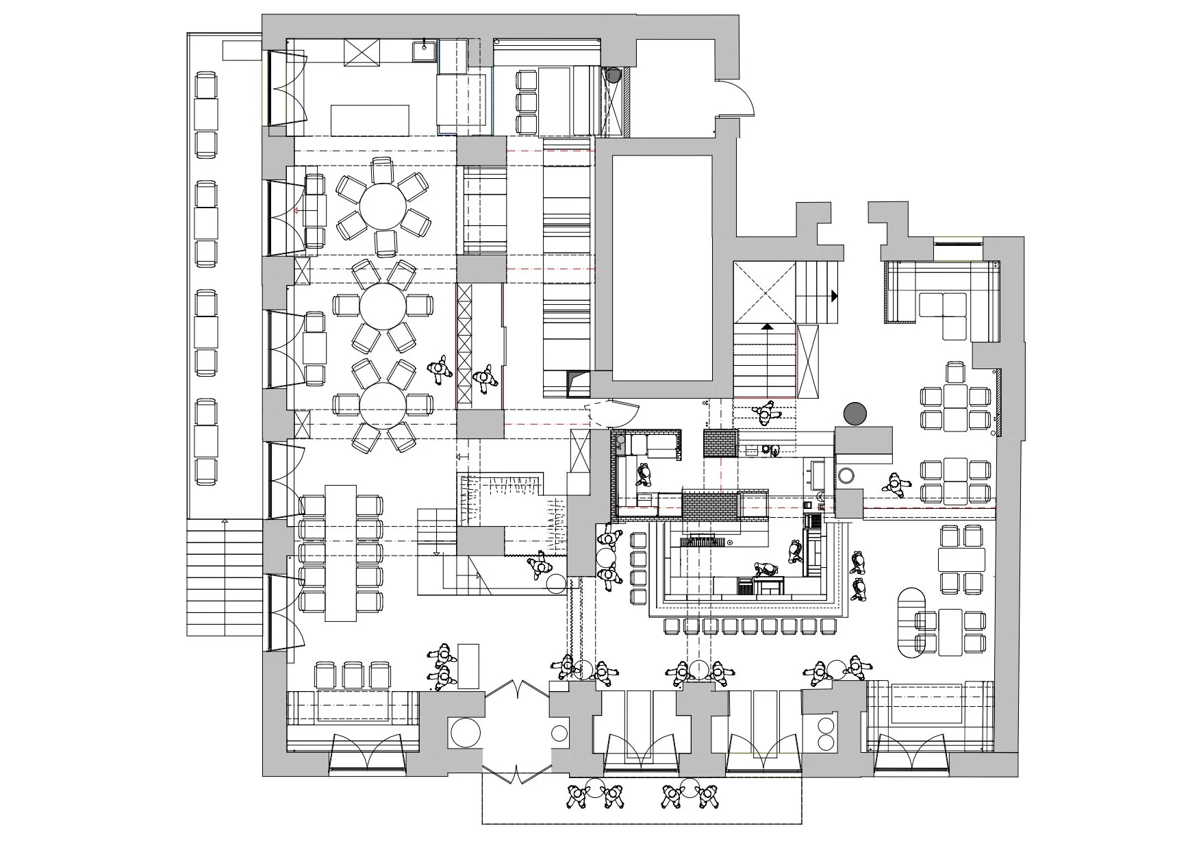 The wall in the hall with the bar counter is encrusted with a large portrait of a pensive-eyed man. That is the portrait of the Georgian Soso, who was in charge of a food store that was located in the very same space in the 1950s. The food store occupied the first floor, and in the basement worked the hidden gambling club where party officials of the city were gathering to play poker. Soso was a legendary character, so we decided to pay him honor with this portrait. It looks old because of the unique drawing technique.